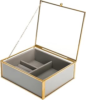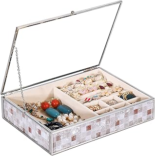 クリアガラスジュエリーボックス ベルベットトレイ付き モダンジュエリーオーガナイザー 蓋付き 防塵 メタル シルバー ジュエリーディスプレイ イヤリングリングブレスレットなどに 寝室 ドレッサー 化粧台に最適 (3タイプセクション)