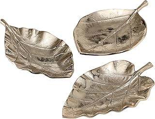 WHW Whole House Worlds メタルリーフディッシュ3点セット 化粧台カウンタートップディスプレイ 装飾的 鋳造ゴールデンシャンパンアルミ 複雑な波と茎の細部 各長さ10.75インチ x 幅7.75インチ