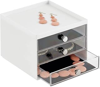 mDesign プラスチック3段引き出しジュエリーボックス ドレッサー、化粧台、カウンタートップの保管に イヤリング/ブレスレット/ネックレス/バングル/リングを保持 ホワイト/クリア